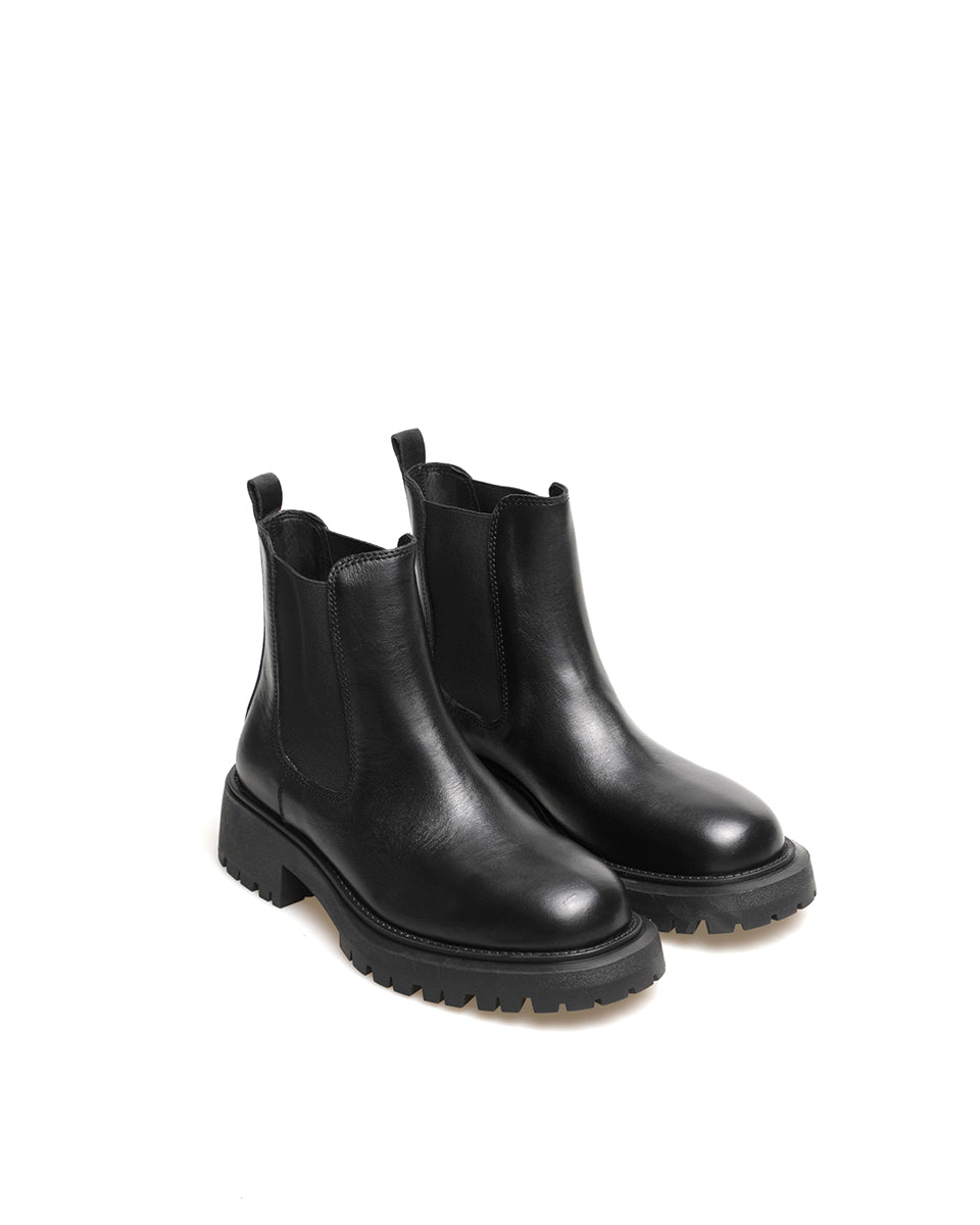 Melia es una bota de caña media-baja con elásticos laterales. Está confeccionada en cuero vacuno y forrada en cuero. La base de goma de altura moderada aporta estabilidad, mientras que su horma combina una silueta estilizada con una presencia firme.