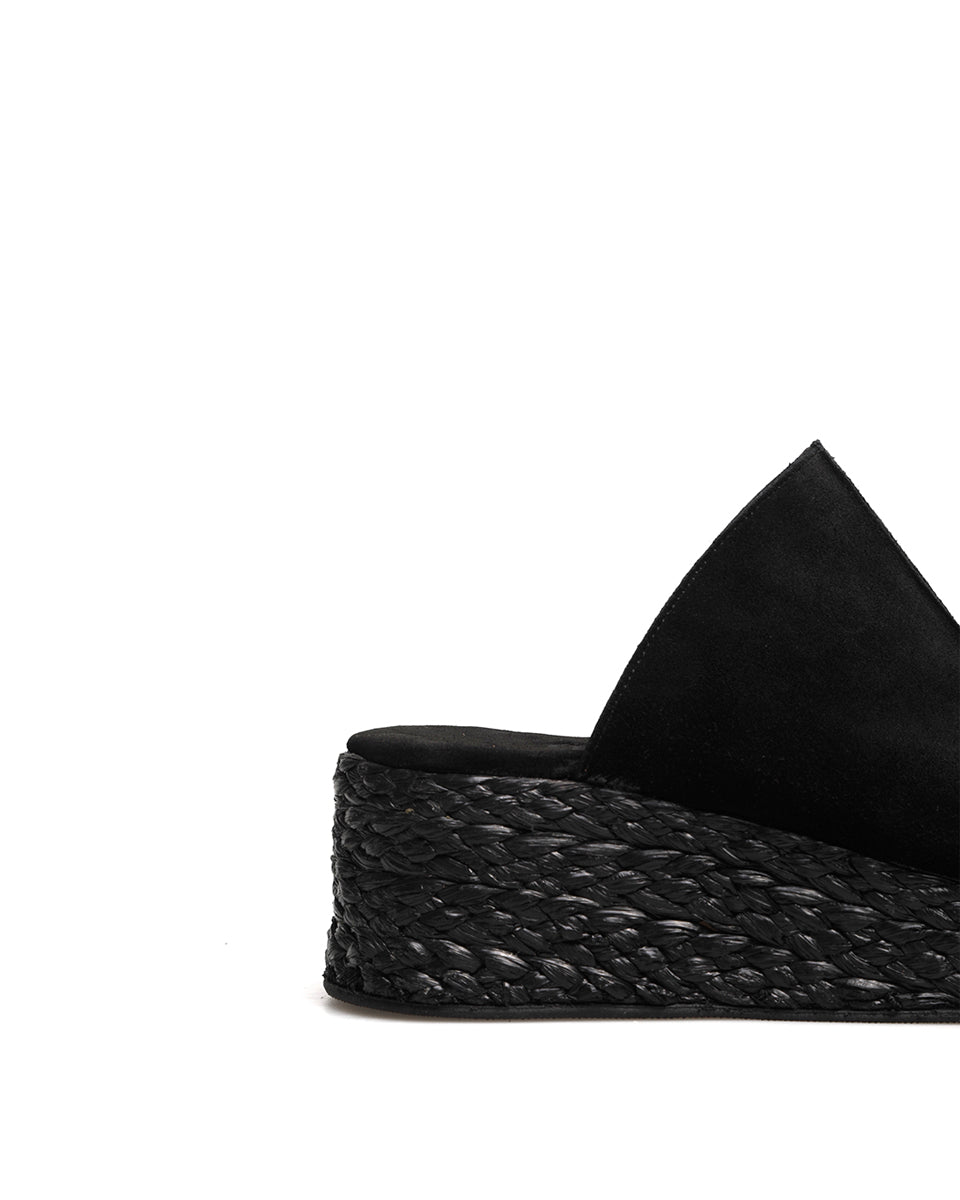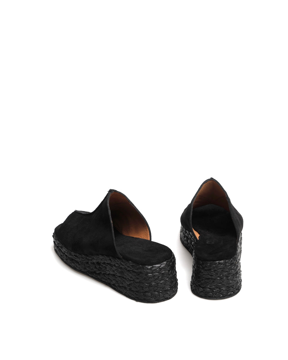 ADELA es una sandalia de calce directo con plataforma forrada en símil yute. Su capellada es de una sola faja de cuero gamuzado con puntera cuadrada. La base tiene goma para mejor agarre y la pendiente es cómoda para uso prolongado. Se adapta especialmente bien a pies angostos o de empeine bajo.