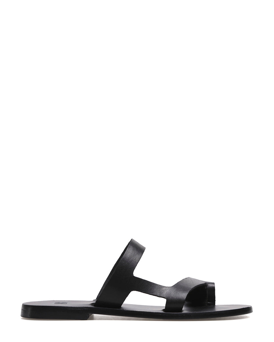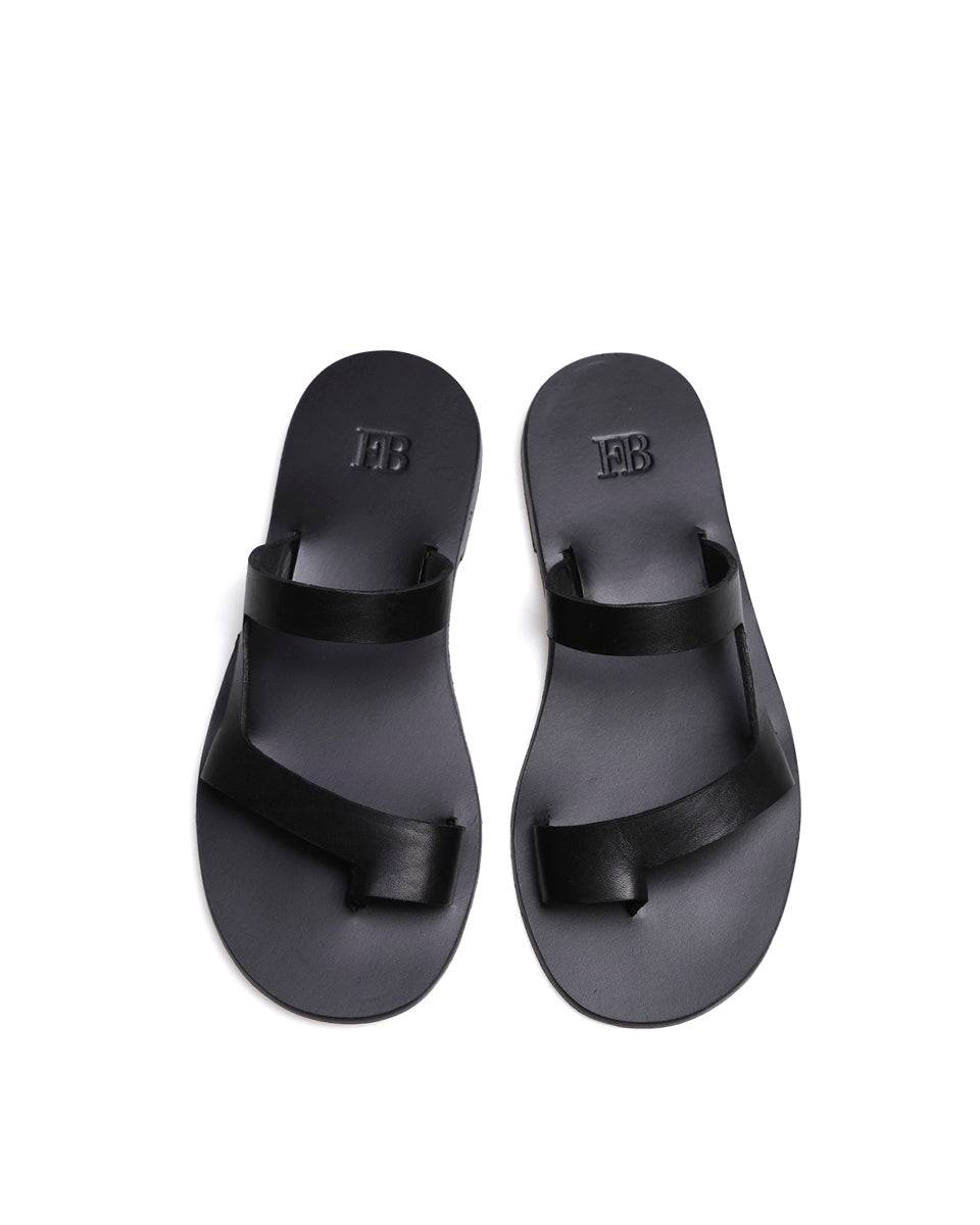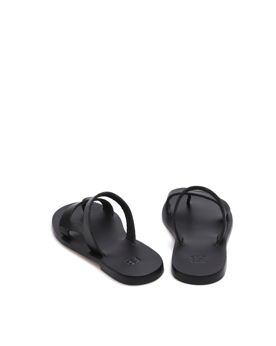 AGATA es una sandalia plana de diseño artesanal. Su capellada de cuero vacuno al corte tiene dos tiras paralelas unidas longitudinalmente y sujeción en el dedo, brindando un calce firme y cómodo. Su base es negra, sobria y liviana.