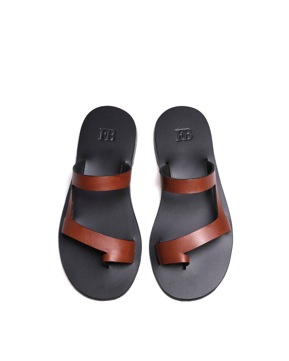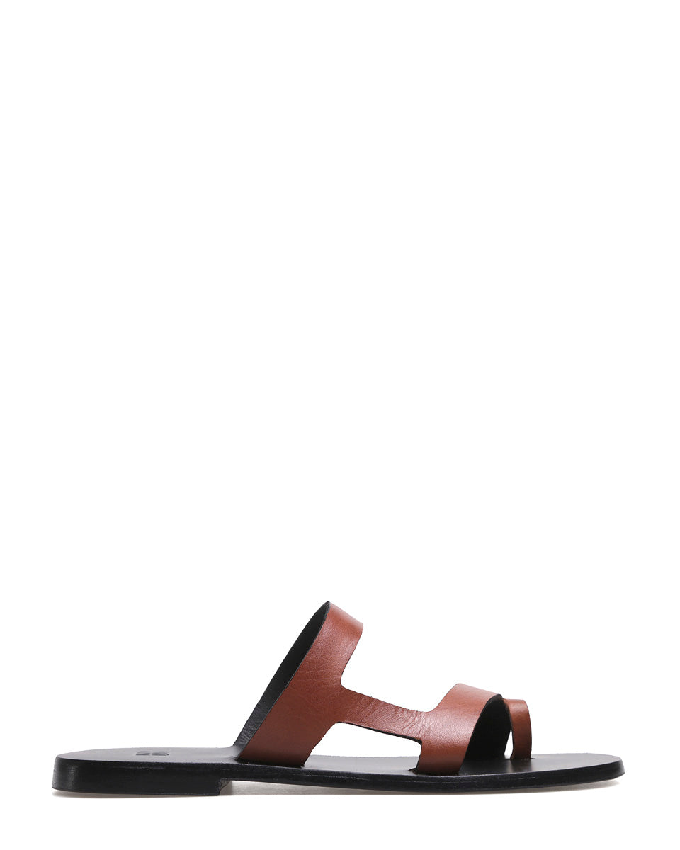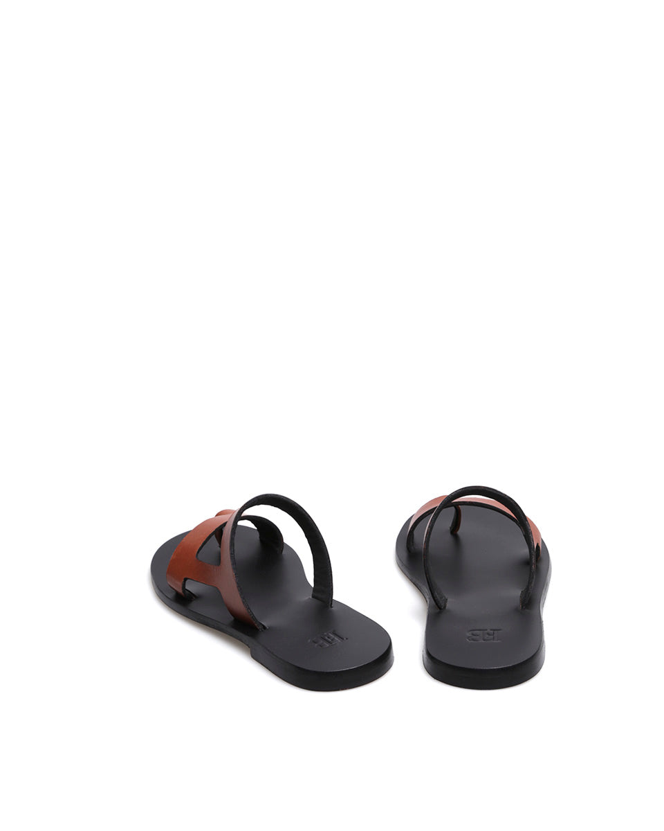 AGATA es una sandalia plana de diseño artesanal. Su capellada de cuero vacuno al corte tiene dos tiras paralelas unidas longitudinalmente y sujeción en el dedo, brindando un calce firme y cómodo. Su base es negra, sobria y liviana.