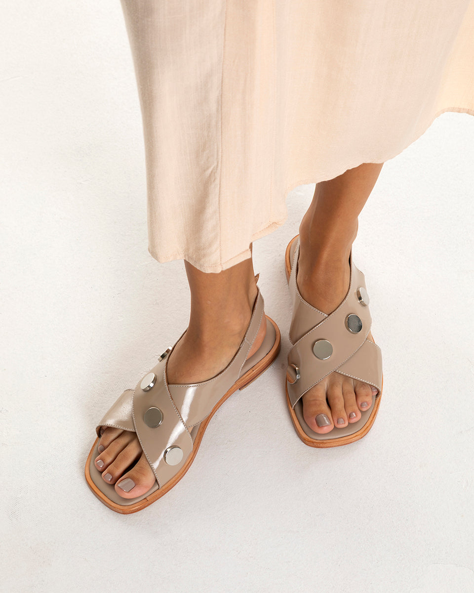 BILY es una sandalia clásica de capellada cerrada en charol de cuero, forrada en cuero. Su base de suela y la vira natural aportan un detalle distintivo que realza el diseño. Con taco bajo y líneas elegantes, es un modelo atemporal pensado para quienes buscan comodidad y refinamiento en un mismo calzado.