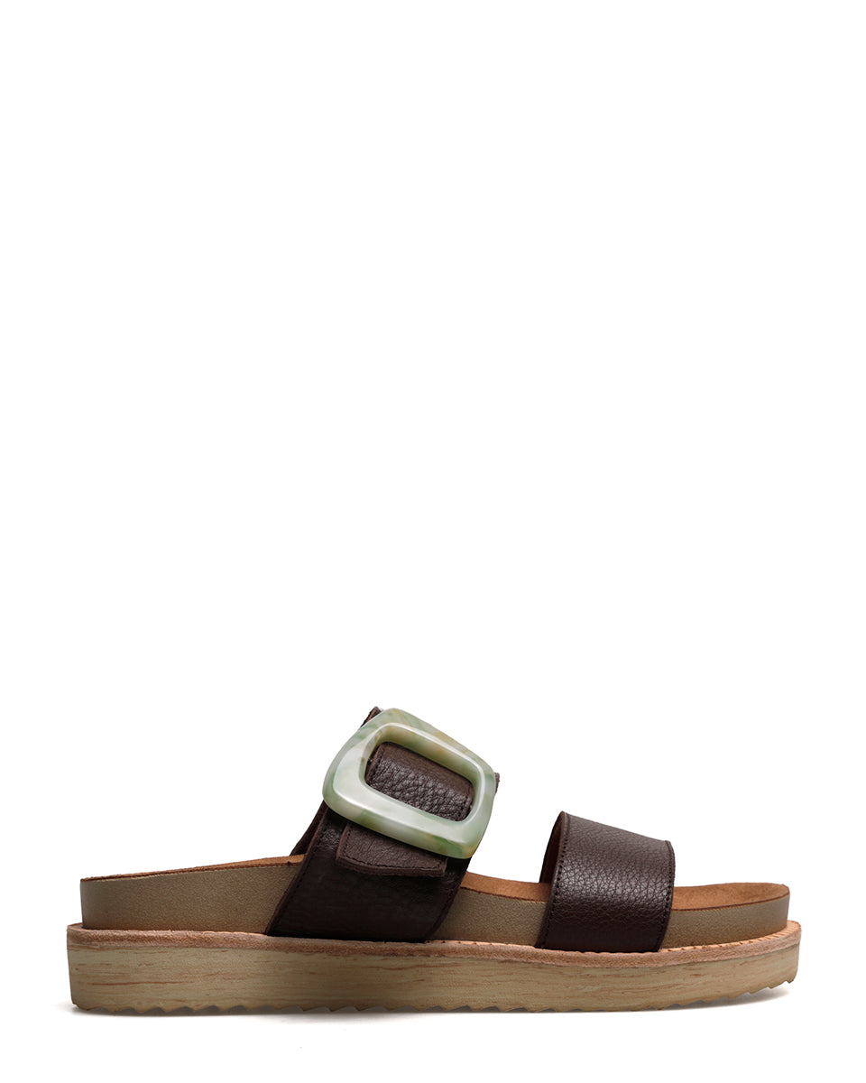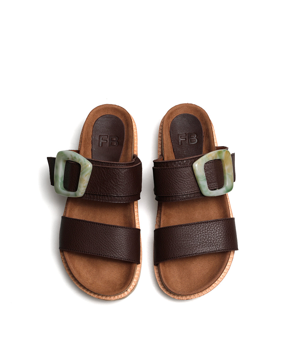 GEMMA es una sandalia de calce fácil con dos tiras paralelas en cuero vacuno graneado. La superior incorpora una hebilla de acrílico en forma orgánica que aporta contraste y vista. Su base de eva, liviana y flexible, junto con la plantilla anatómica, brindan comodidad haciendo de GEMMA un calzado fresco y práctico con un toque especial en su diseño.