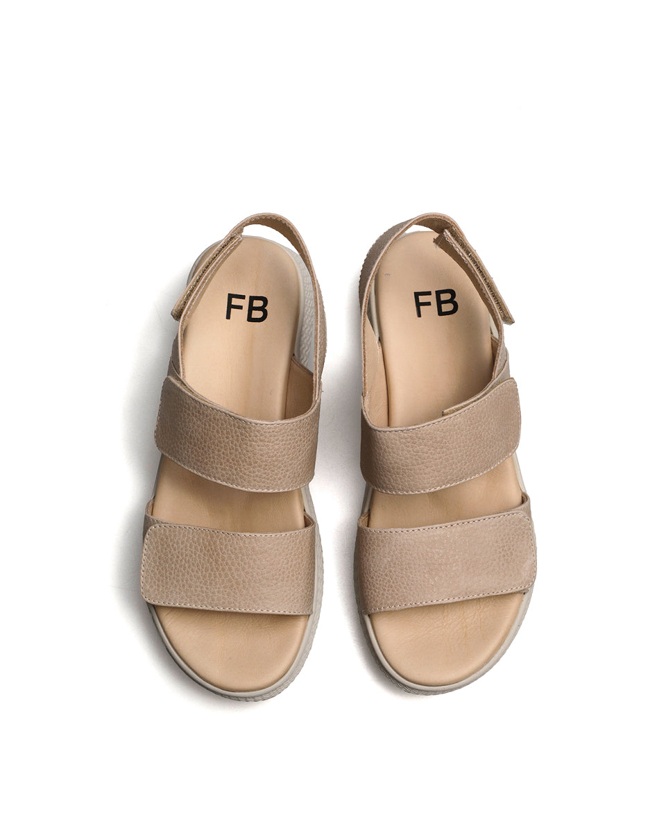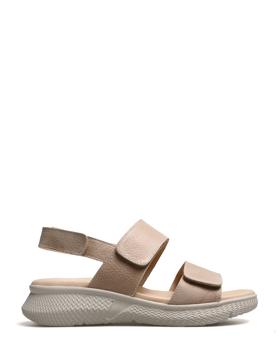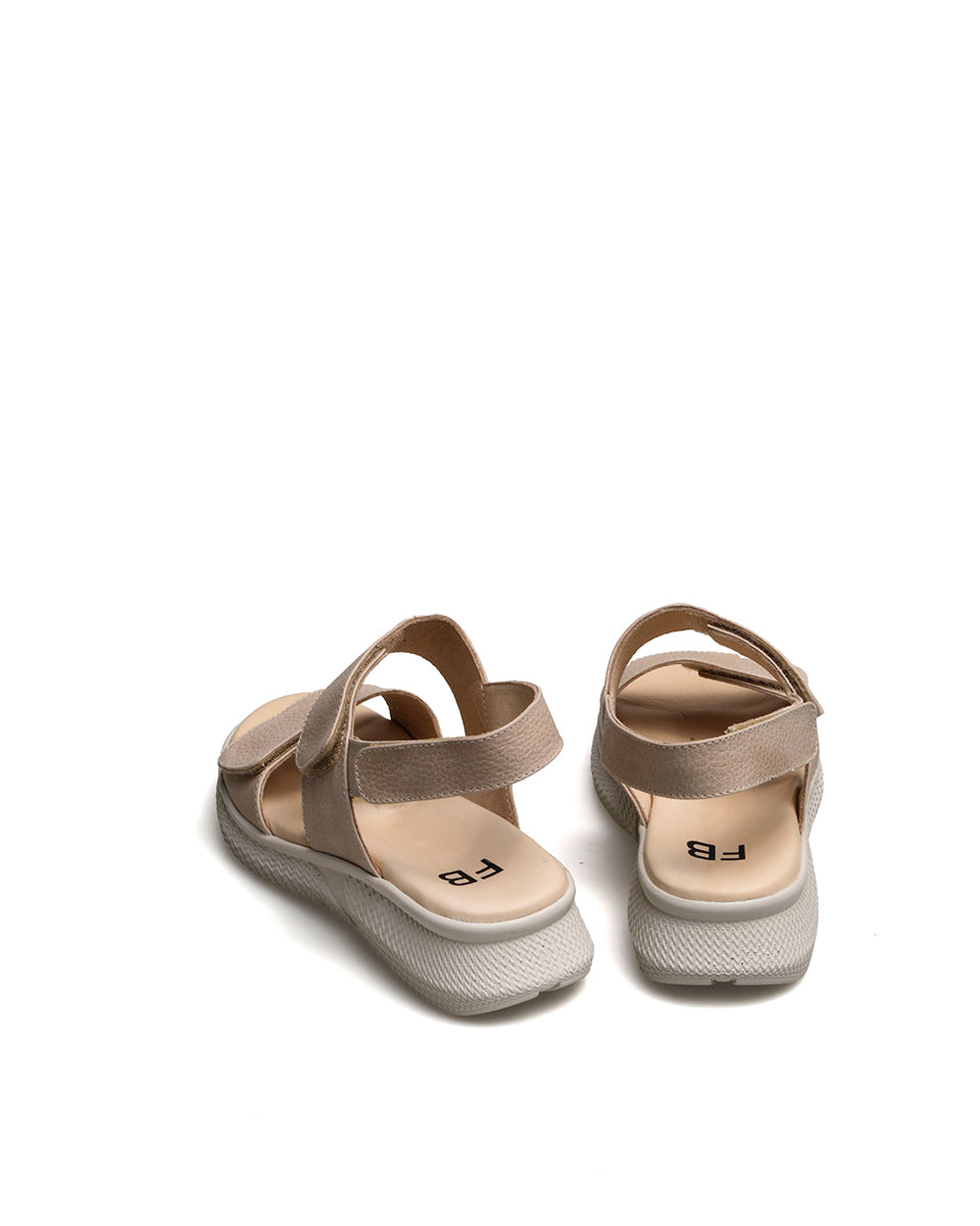 KALA es una sandalia de estilo deportivo con base color marfil, liviana y flexible. Está realizada en cuero mate graneado y se ajusta con velcro en las tiras de la capellada y el talón. Su plantilla ergonómica y mullida asegura comodidad en cada paso, ideal para un uso cotidiano y dinámico.