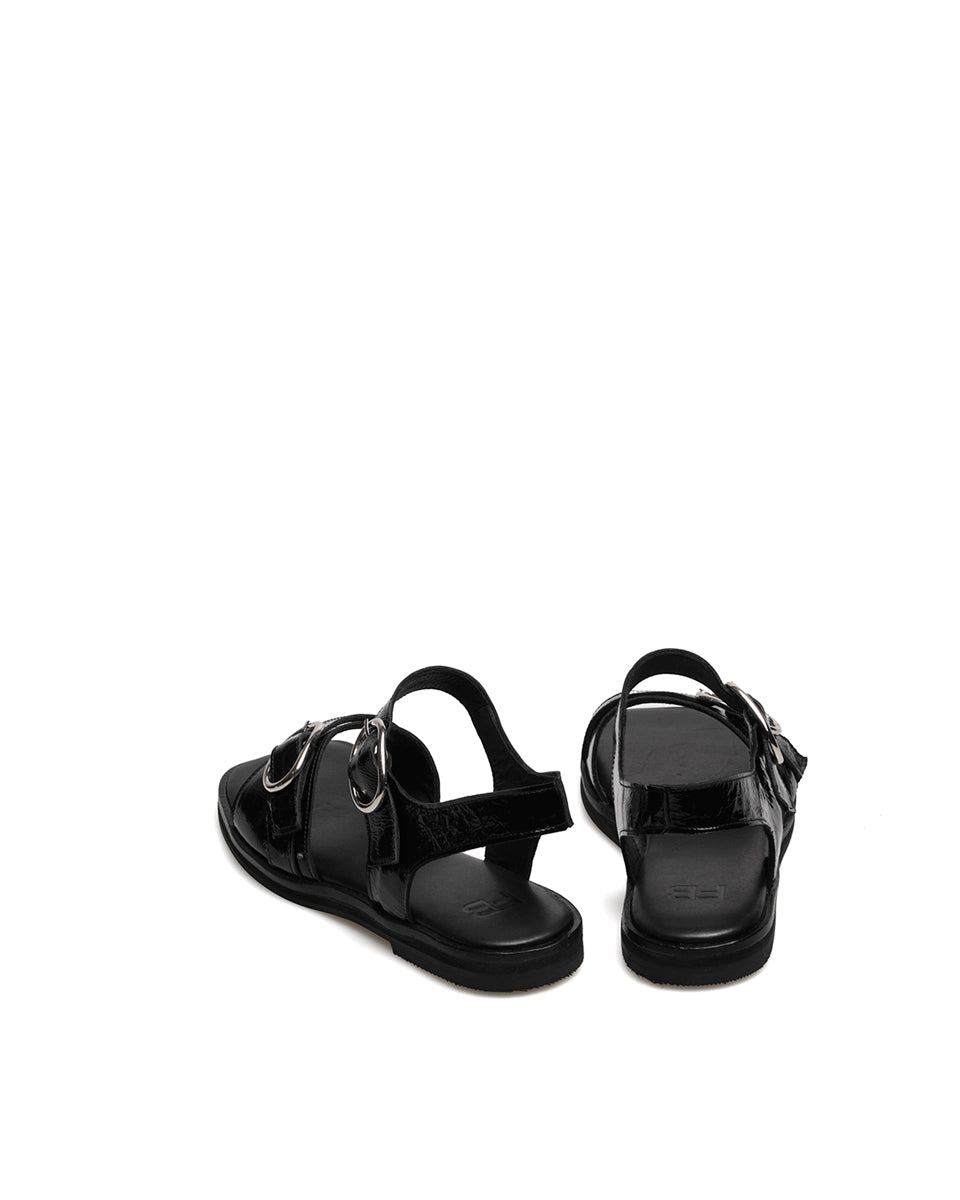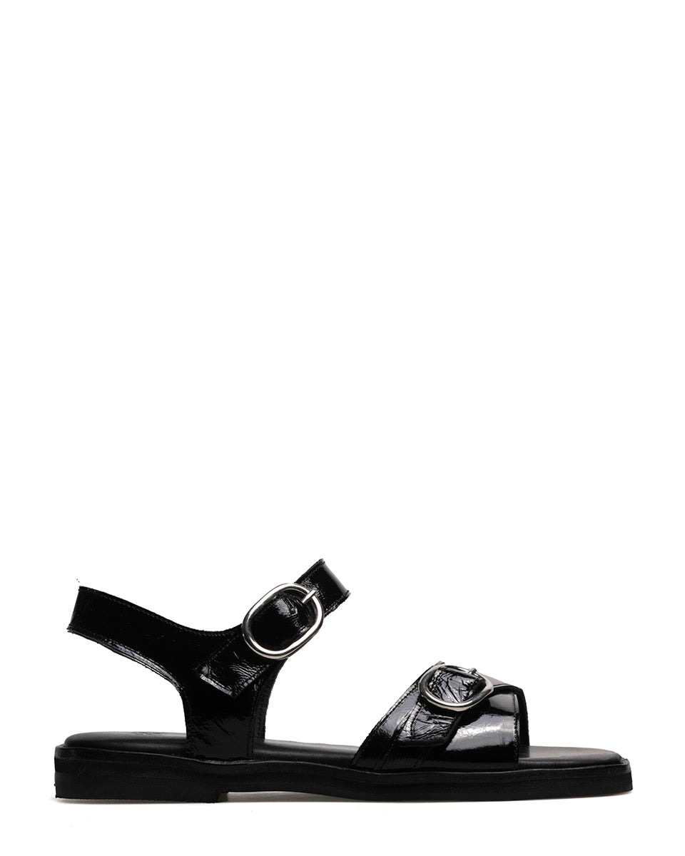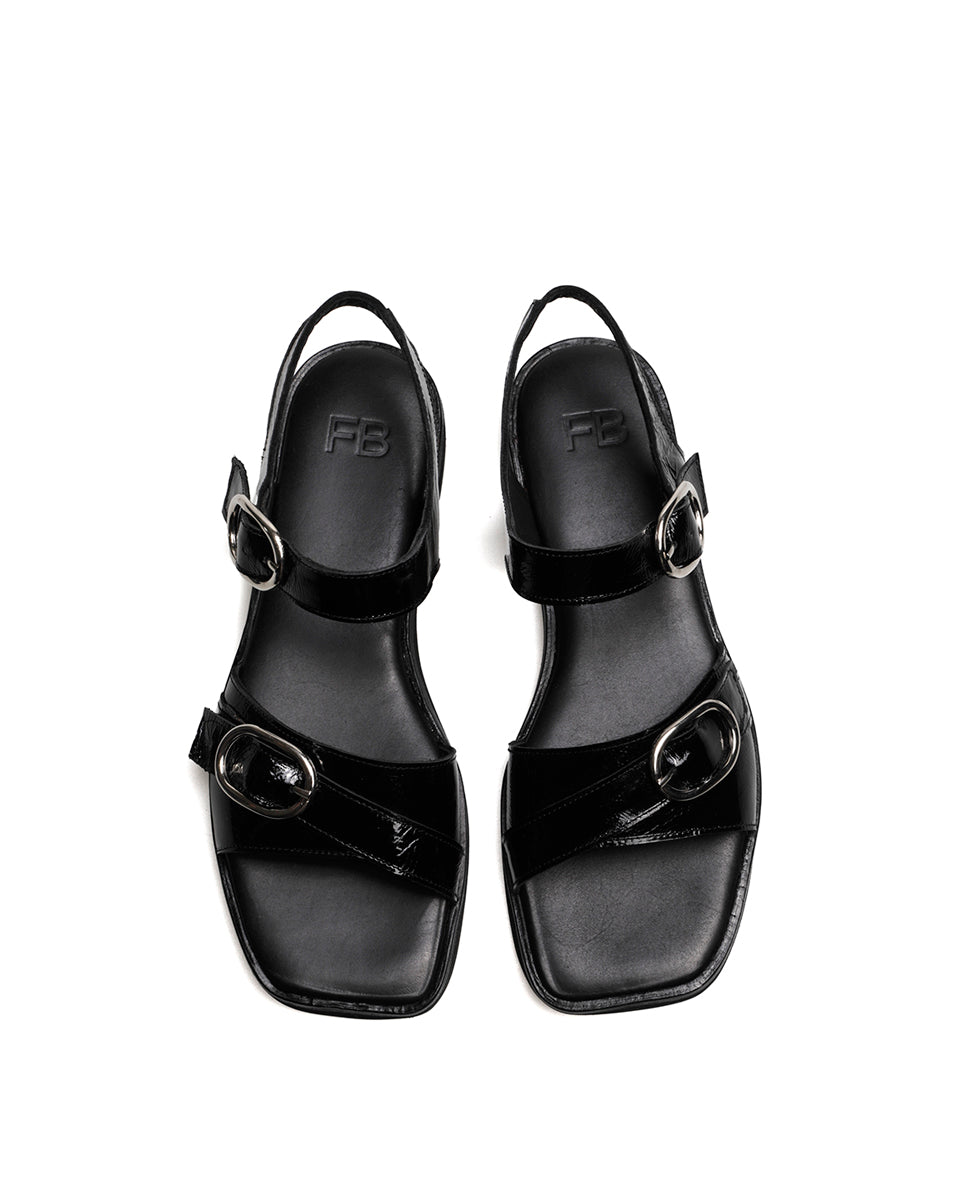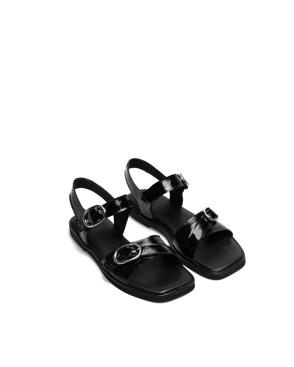 LOIS es una sandalia baja y elegante, con plataforma mínima y puntera cuadrada. Sus dos hebillas ovaladas en níquel resaltan sobre el charol de cuero, aportando un detalle distintivo. Forrada íntegramente en cuero, es un diseño versátil y sofisticado.