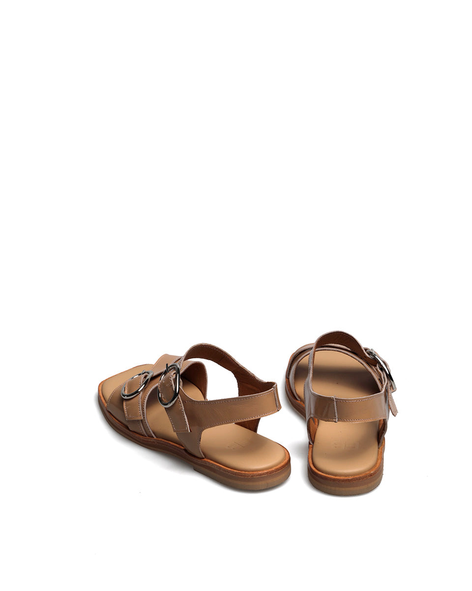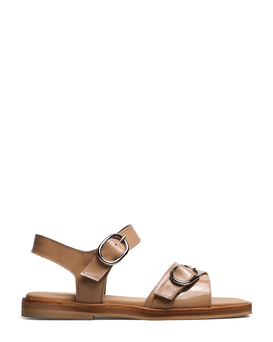 LOIS es una sandalia baja y elegante, con plataforma mínima y puntera cuadrada. Sus dos hebillas ovaladas en níquel resaltan sobre el charol de cuero, aportando un detalle distintivo. Forrada íntegramente en cuero, es un diseño versátil y sofisticado.