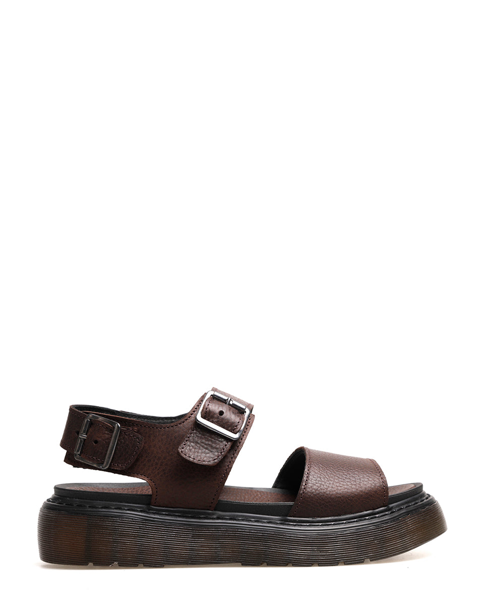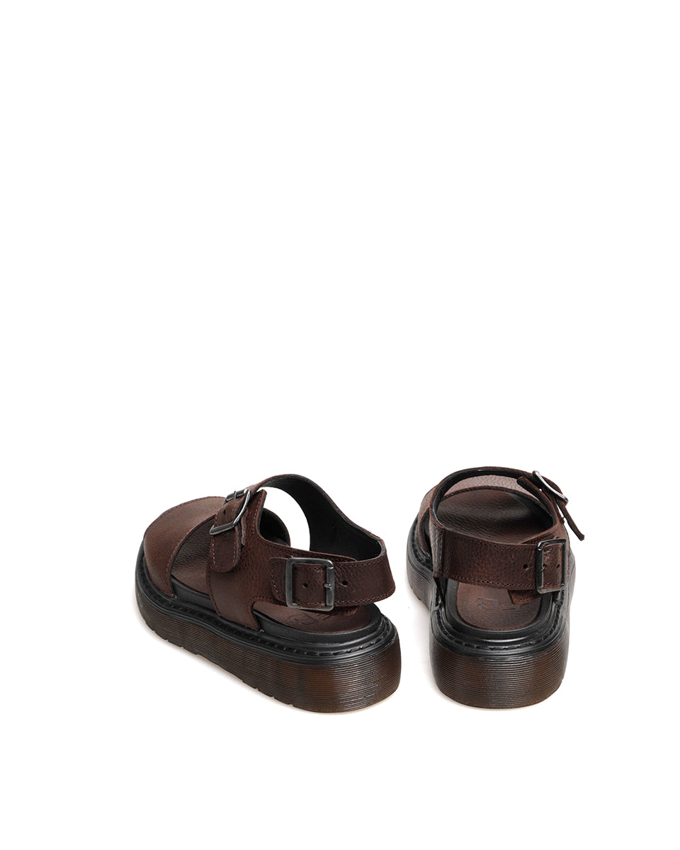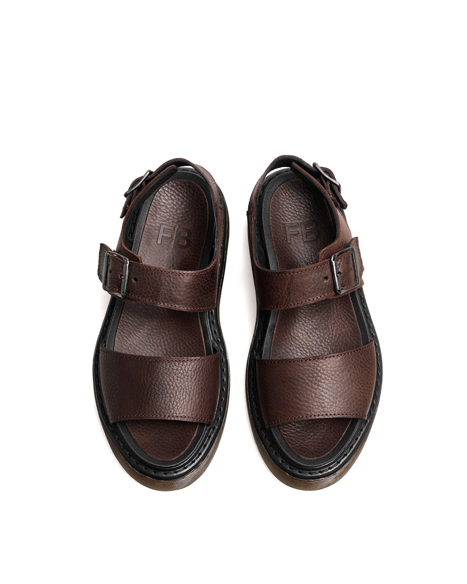 LUTON es una sandalia de cuero graneado con dos hebillas regulables que aseguran un buen ajuste. Su base, de tono ámbar transparente, es firme y con carácter, aportando estabilidad y presencia. Un modelo robusto y con estilo definido, ideal para quienes buscan un calzado con personalidad.