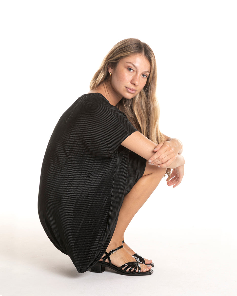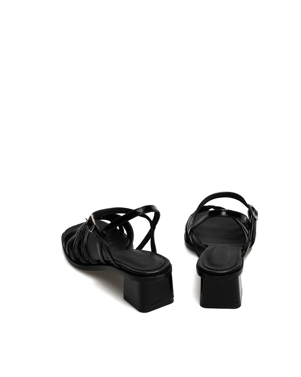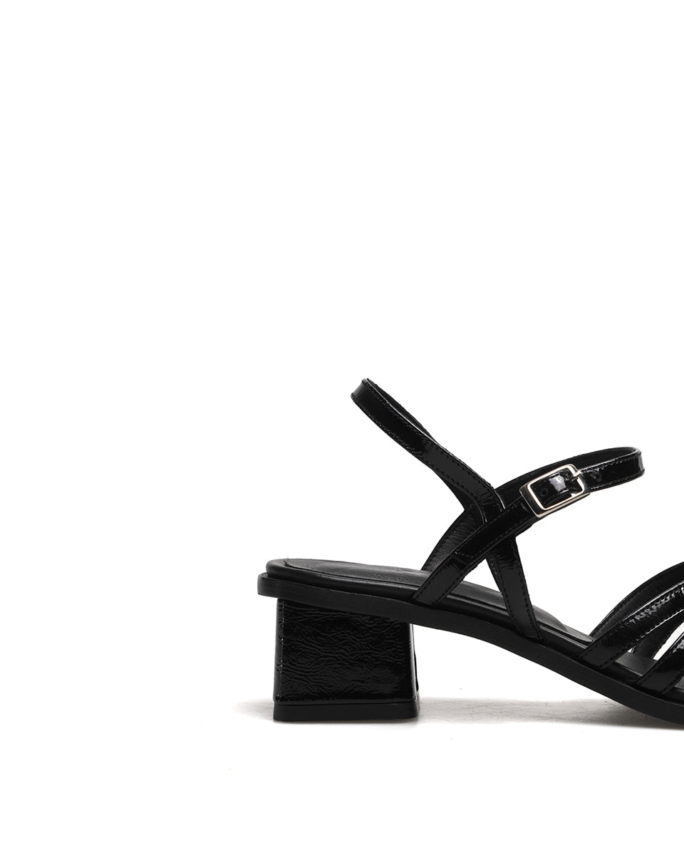 MANE es una sandalia delicada y elegante, realizada en charol de cuero con tiras finas que se entrelazan formando un diseño armónico en el empeine. Su taco medio, estable y cómodo, junto con la puntera cuadrada, la convierten en un modelo ideal para la noche o para sumar un detalle sofisticado en looks diarios.