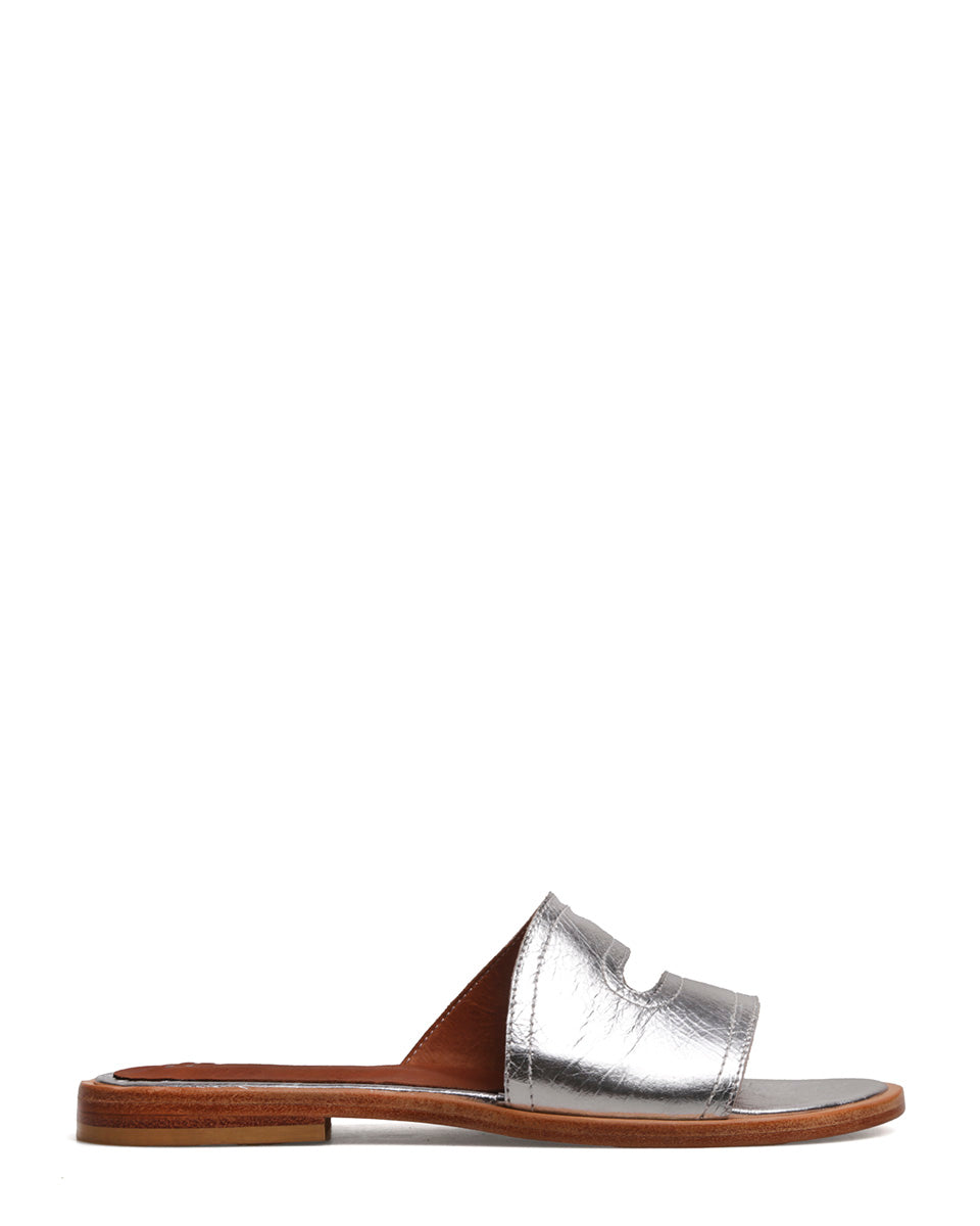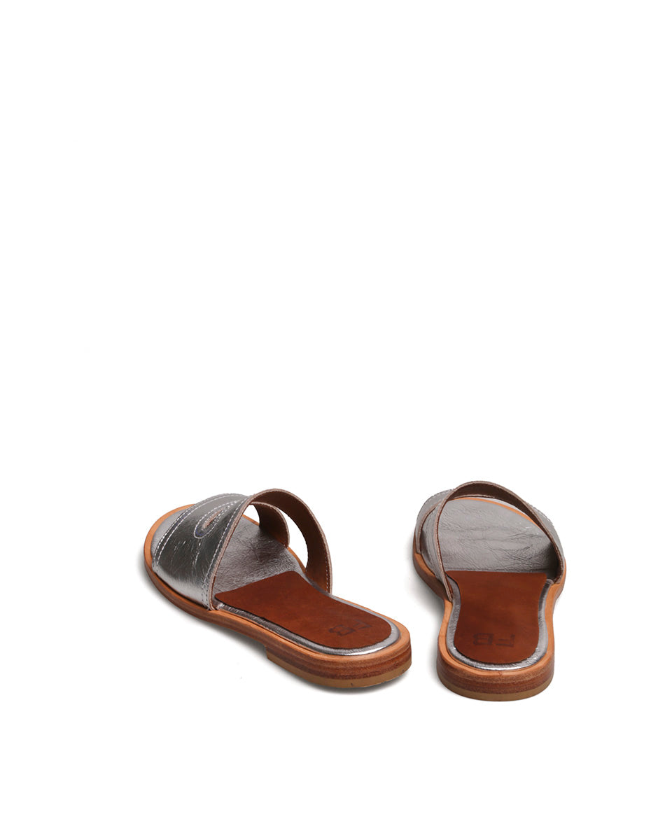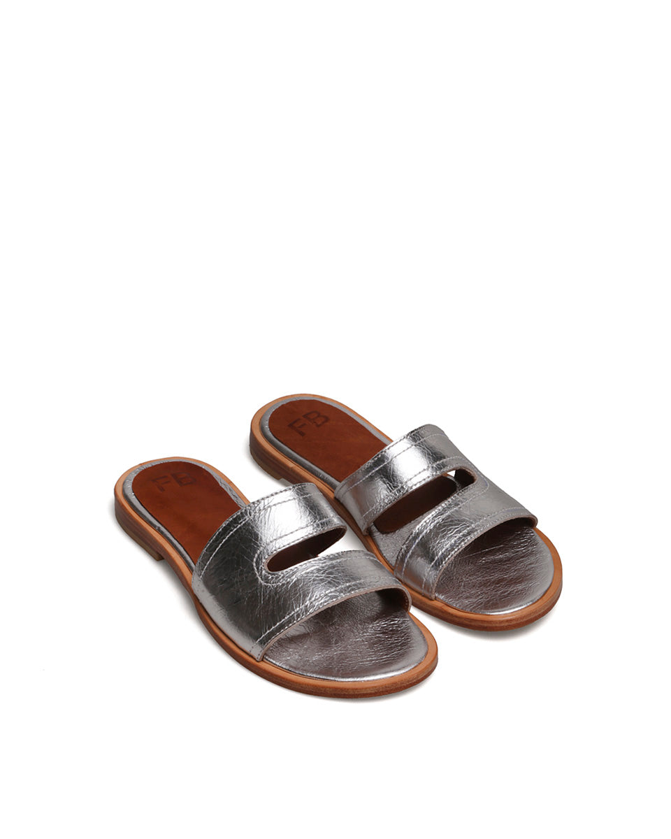 OLA es una sandalia plana realizada en cuero metalizado. Su diseño por un lado es clásico, pero a la vez tiene líneas curvas y fluidas que suavizan su estructura. La base es elegante, con un pequeño taco. OLA es un ítem práctico y sencillo de llevar, ideal para darle un toque a cualquier conjunto de verano.