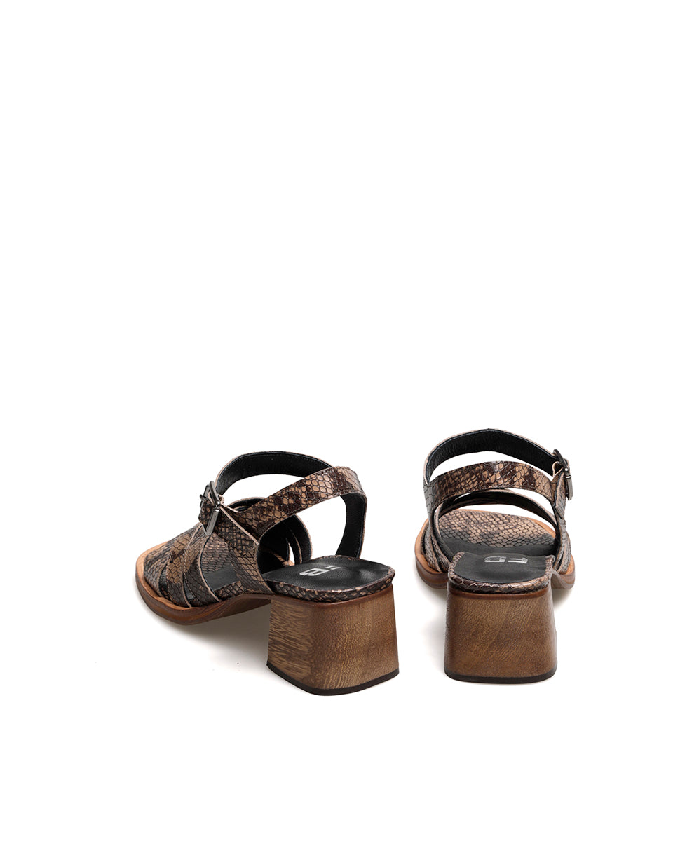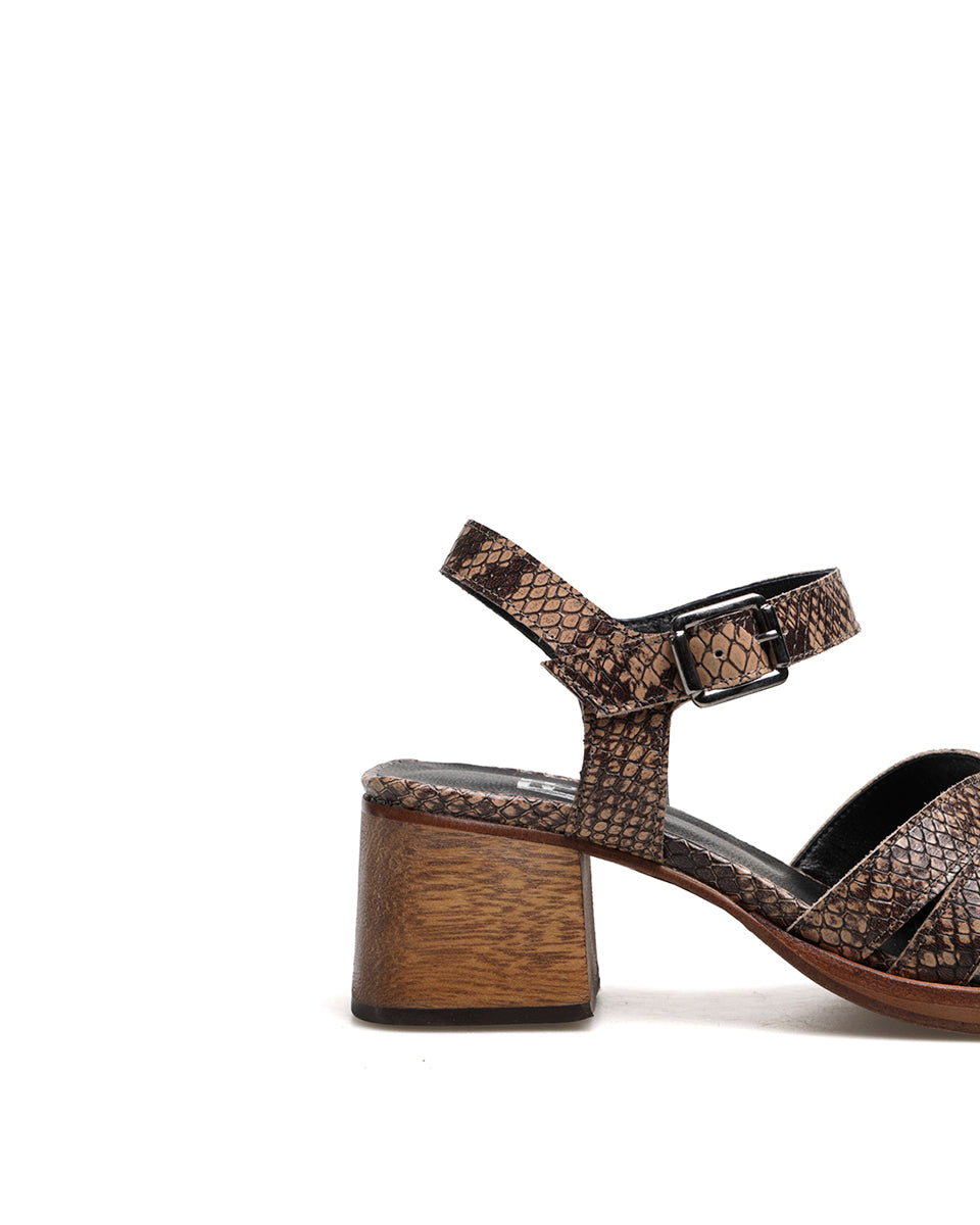 SIMONE es una sandalia de vestir con un aire relajado que también funciona en looks informales como con jeans. Su taco de madera clara lustrada aporta calidez y naturalidad. El diseño de tiras cruzadas con pulsera y la puntera cuadrada logran una silueta actual y sentadora. Realizada en cuero con textura estampada, es un modelo versátil y con estilo.
