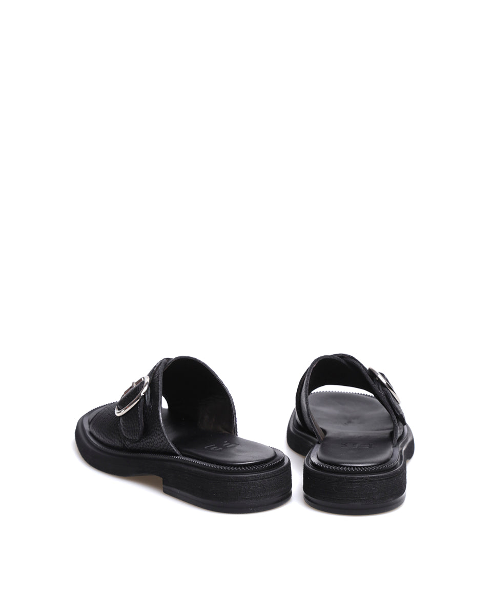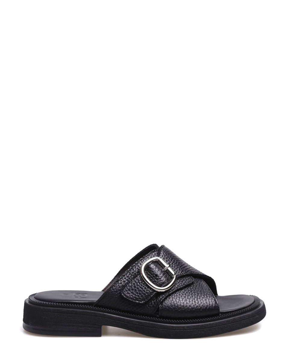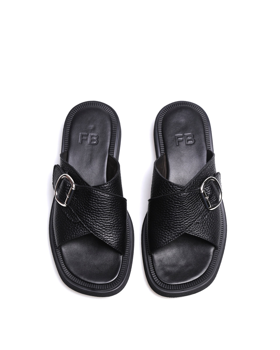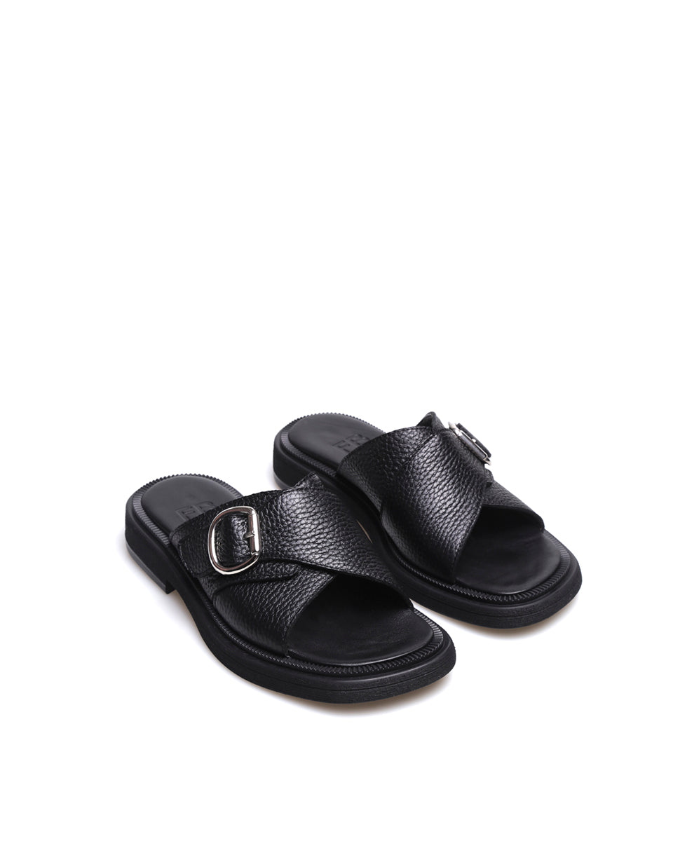 TAURO es una sandalia de calce directo con base de goma flexible y puntera suavemente cuadrada. Sus dos tiras se cruzan en el empeine formando una faja con una hebilla plateada de gran presencia. Un diseño práctico y cómodo, con un detalle distintivo que suma carácter a cualquier look.