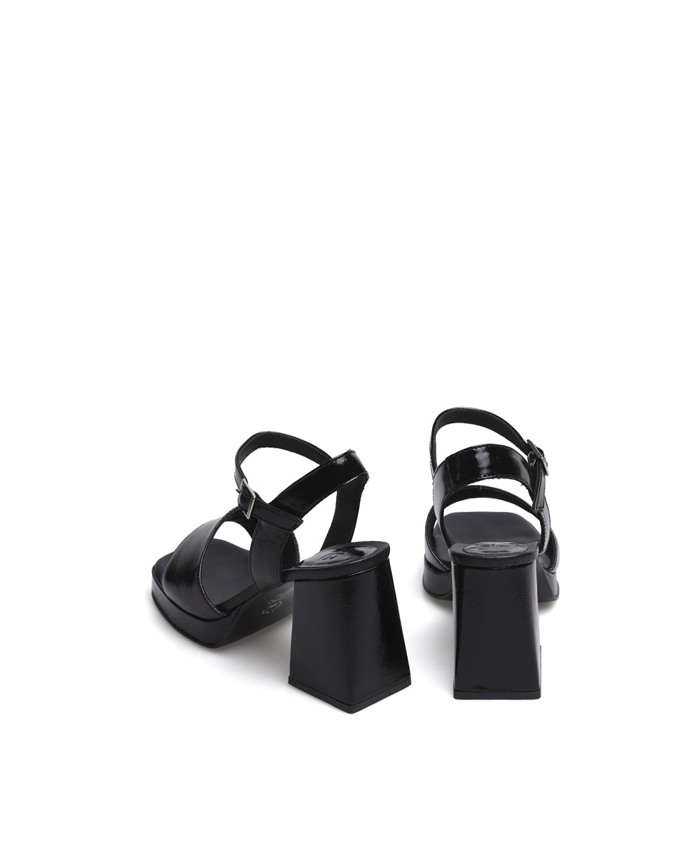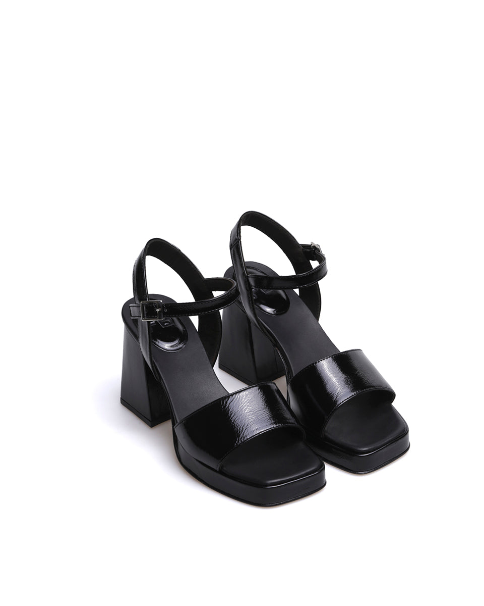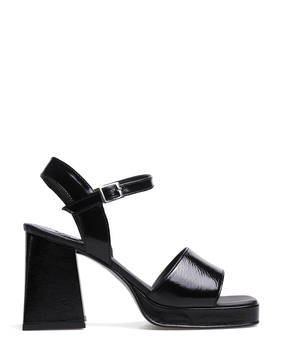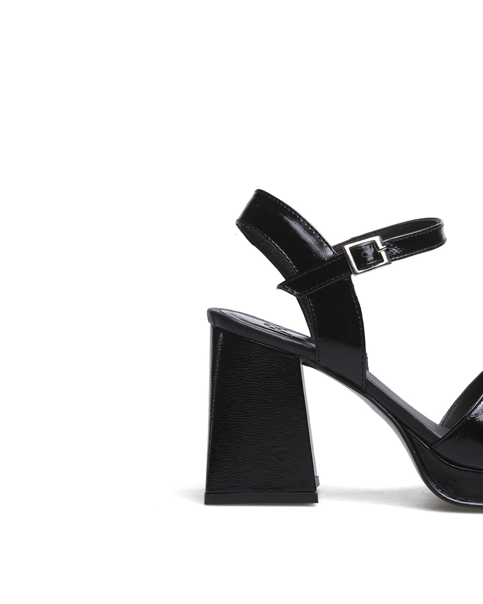 VERNET es una sandalia de charol de cuero con taco ancho. Elegante y cómoda, ideal para looks de día y de noche. Su diseño versátil combina moda y confort, perfecto para usar en ocasiones especiales o en un estilo urbano chic.