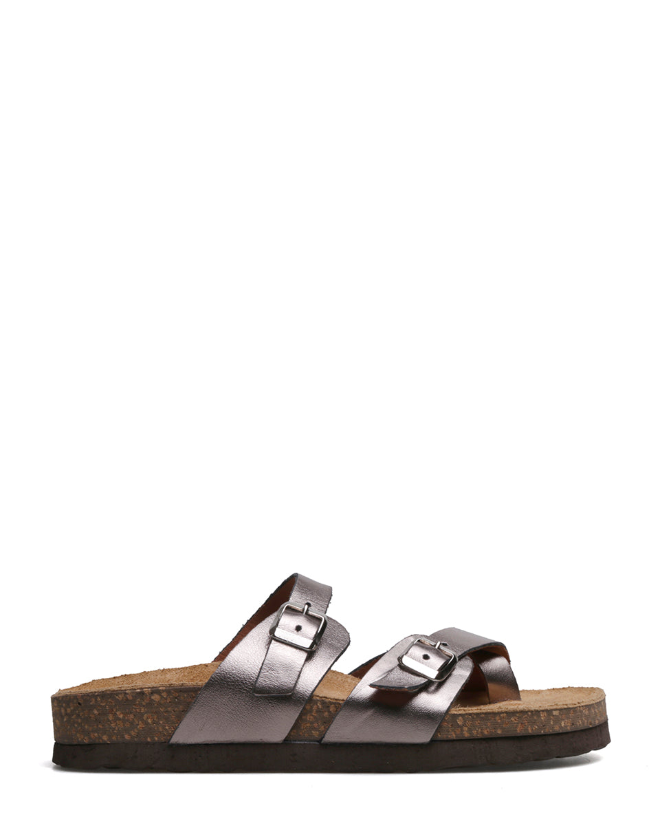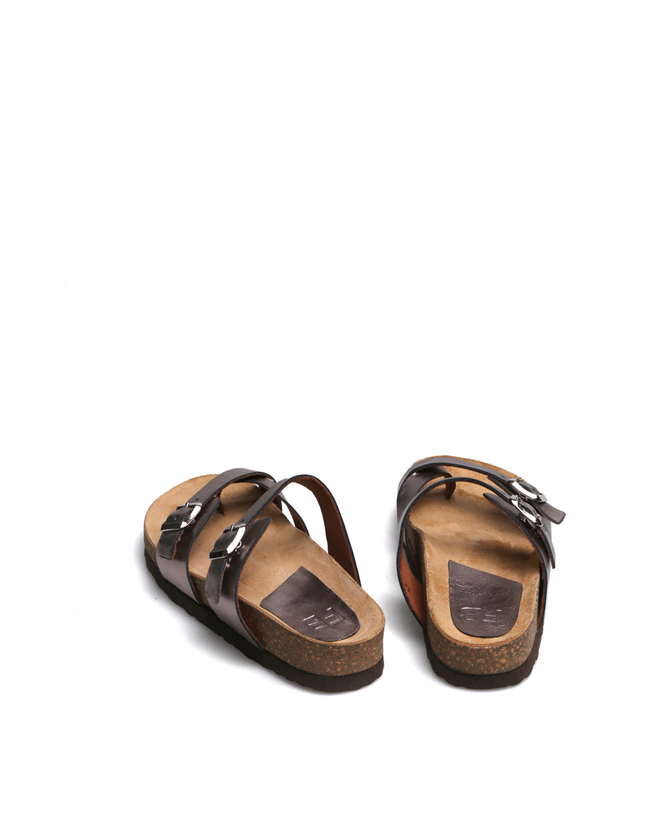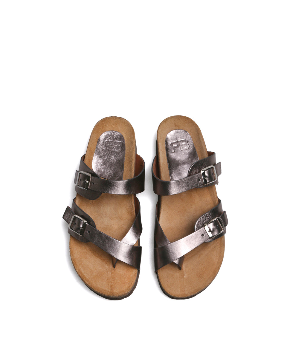 YARI es una sandalia de suela de corcho y calce directo. Está realizada en cuero vacuno de acabado metalizado y forrada en cuero. Cuenta con delicadas tiras con hebillas que se cruzan sujetando el empeine y el dedo gordo. La base de corcho y látex es muy liviana. YARI es un calzado práctico y estilizado para uso habitual.