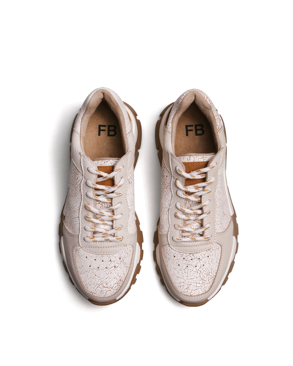 Este calzado está realizado en cuero crash el cual presenta un tratamiento que le otorga un aspecto craquelado. El material es delicado y se cuida con un cepillo suave en seco y es esperable que sus características se exacerbes con el uso.