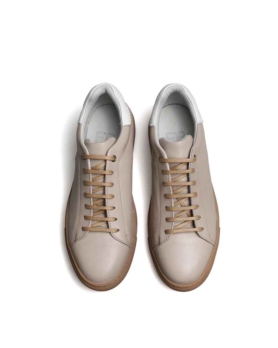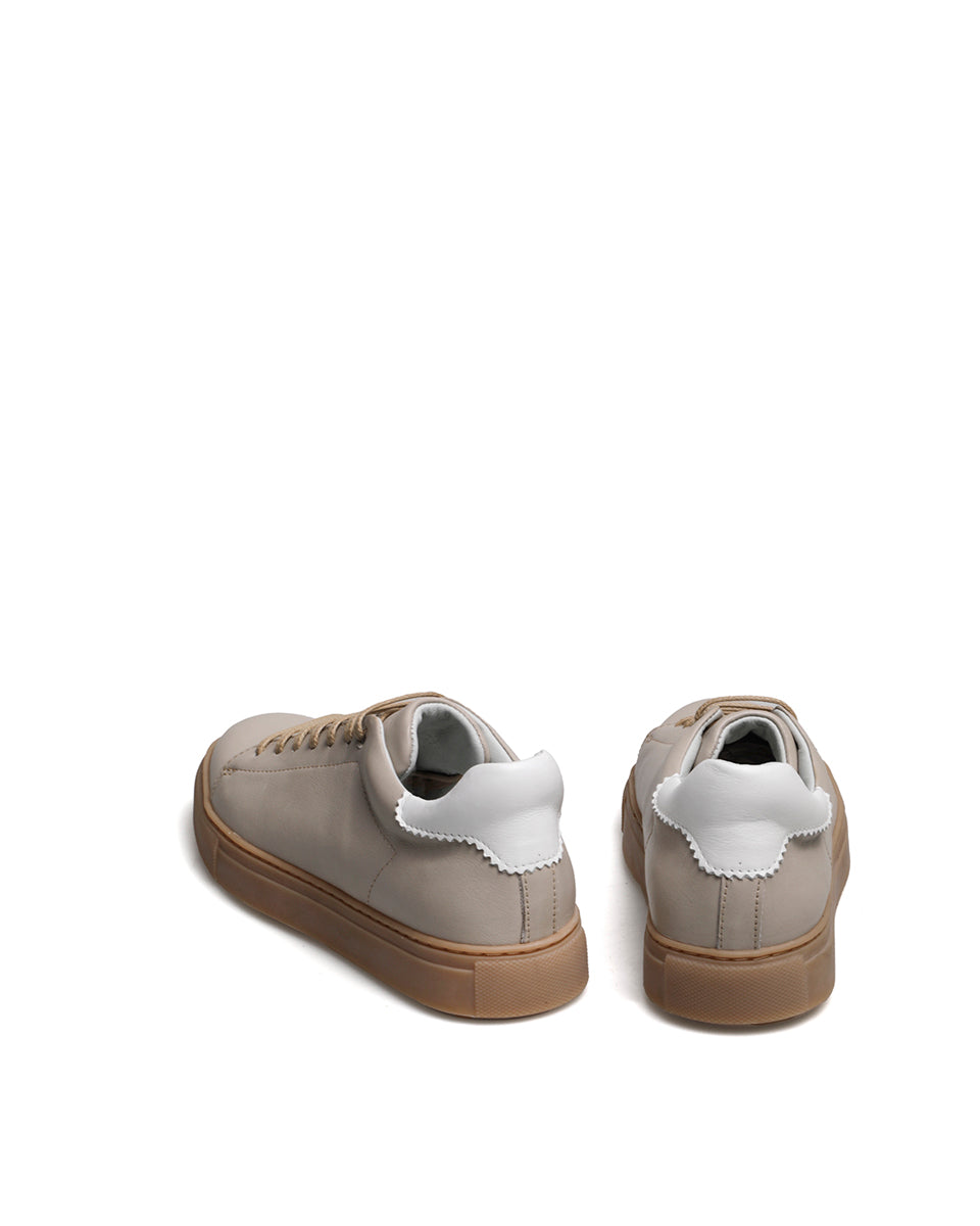 TARAN es una zapatilla de cuero, forrada íntegramente en el mismo material para mayor confort y durabilidad. Su diseño clásico y neutro se realza con el detalle del talón en color crudo, que aporta contraste y carácter. La suela de goma, pegada y cosida, asegura resistencia y un uso prolongado, convirtiéndola en un básico versátil para todos los días.