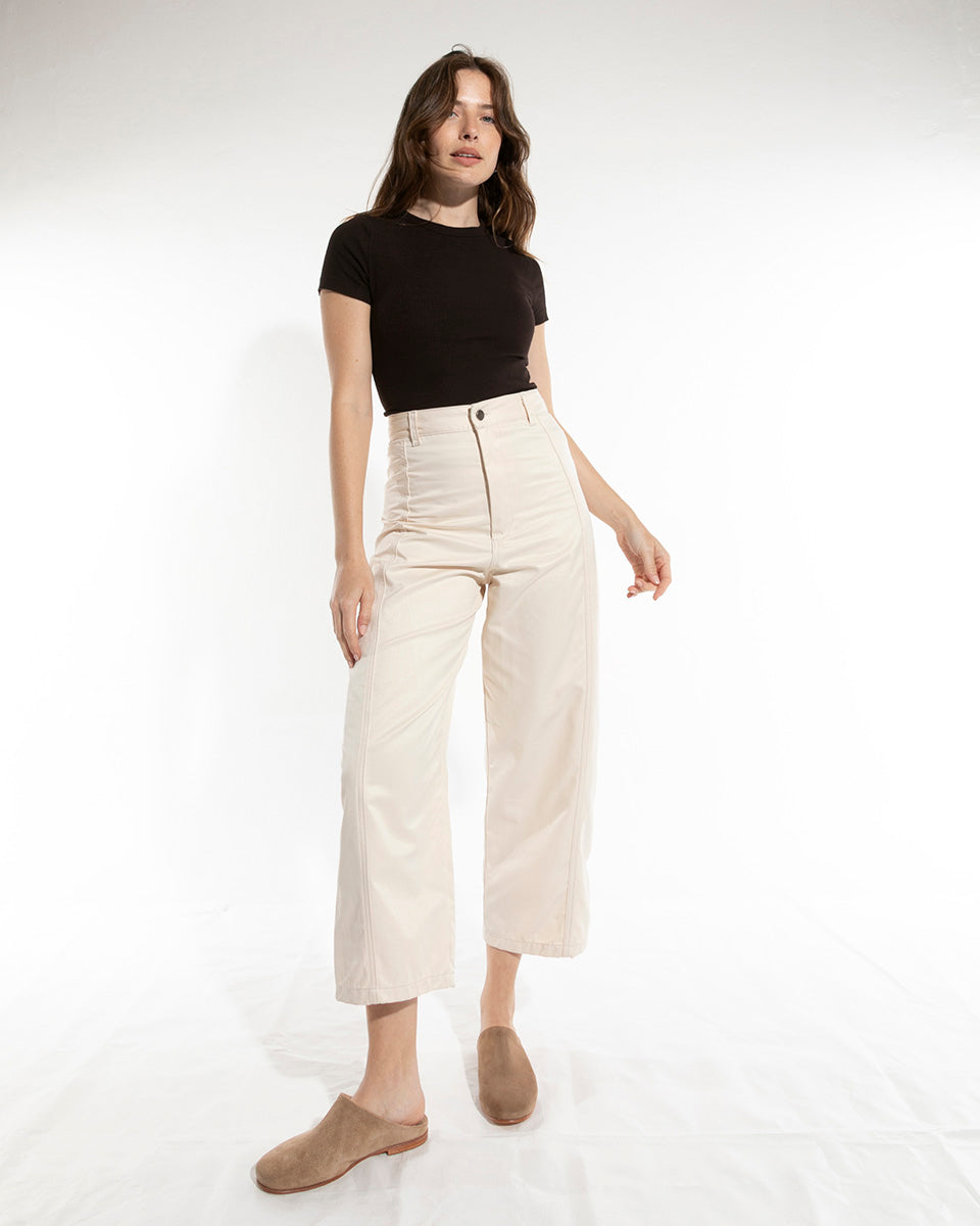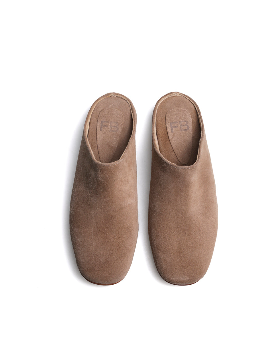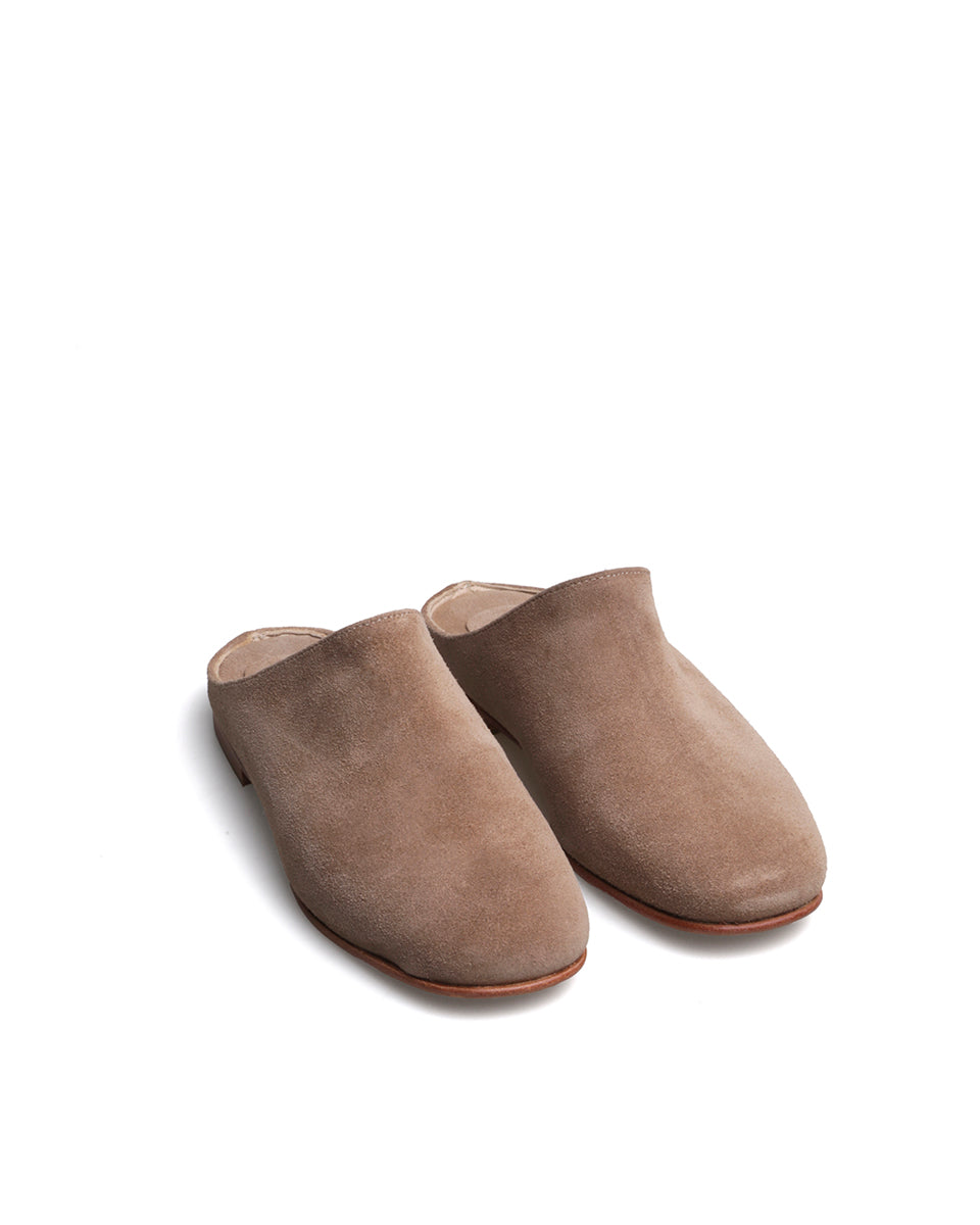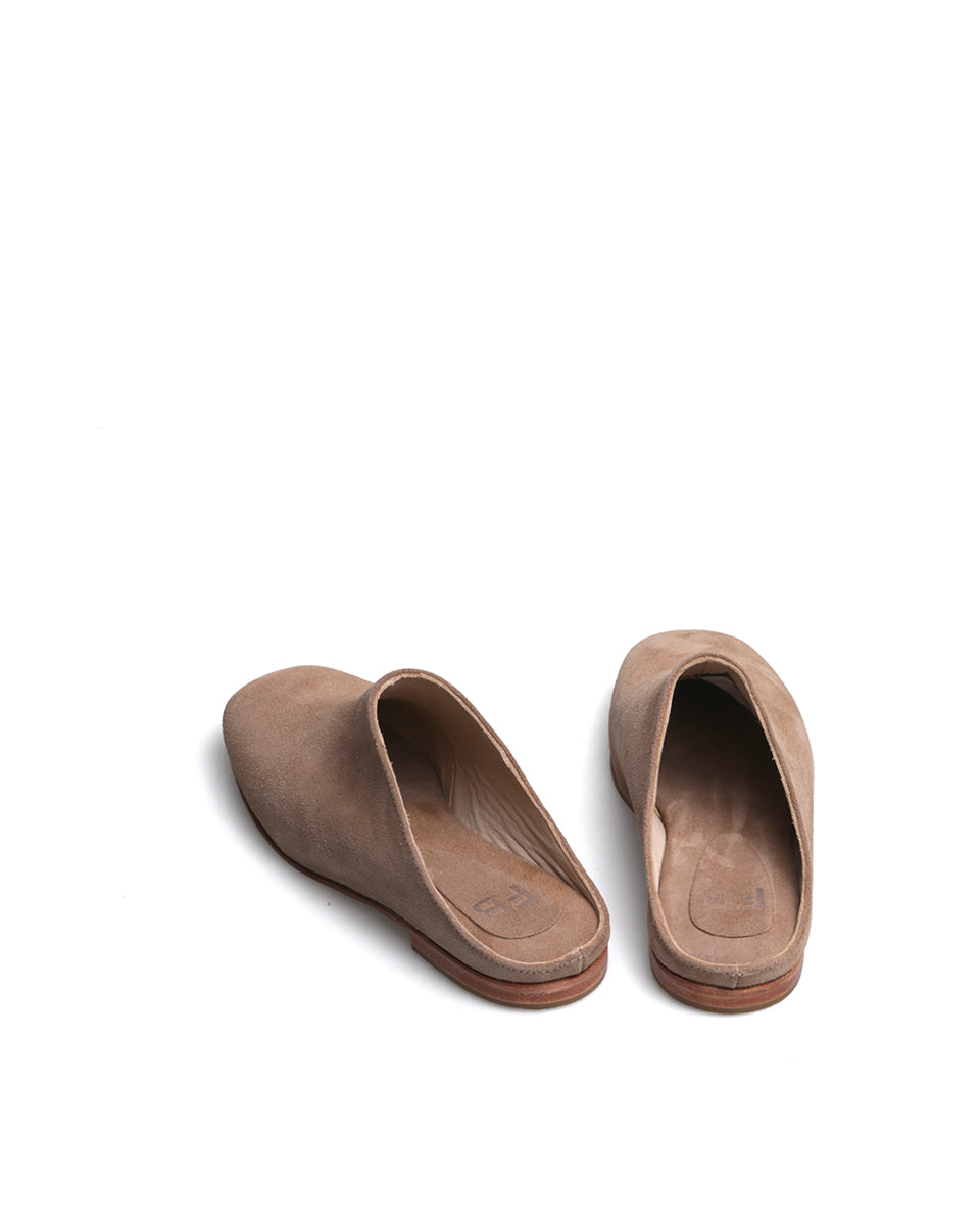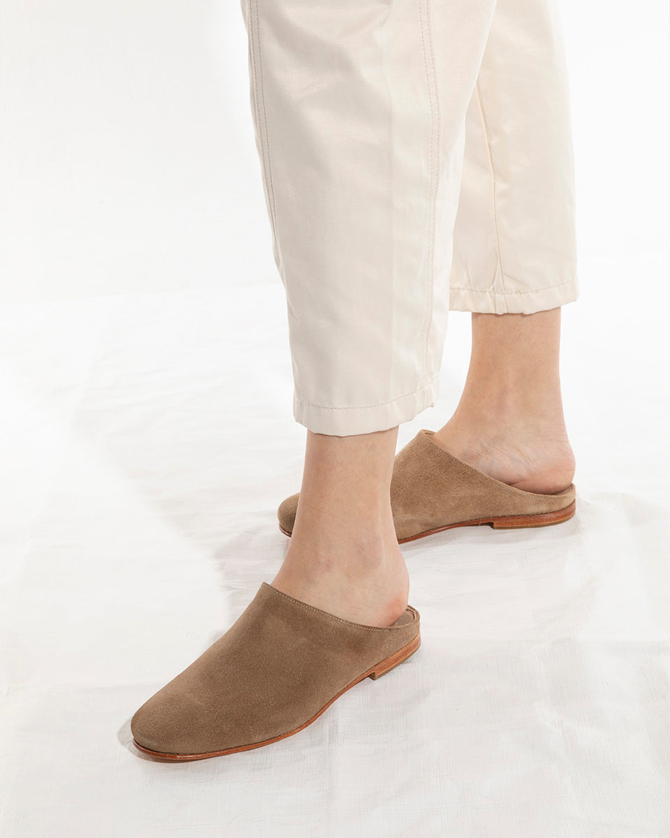 BE es un zueco de gamuza con forro de cuero. Es práctico y cómodo, con una línea minimalista y estilizada. La puntera ligeramente cuadrada y la suela de cuero realzan su estilo clásico y versátil, perfecto para acompañar distintos momentos del día a día.