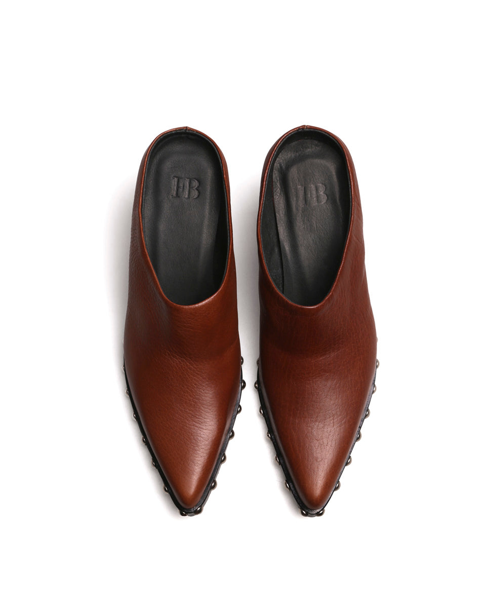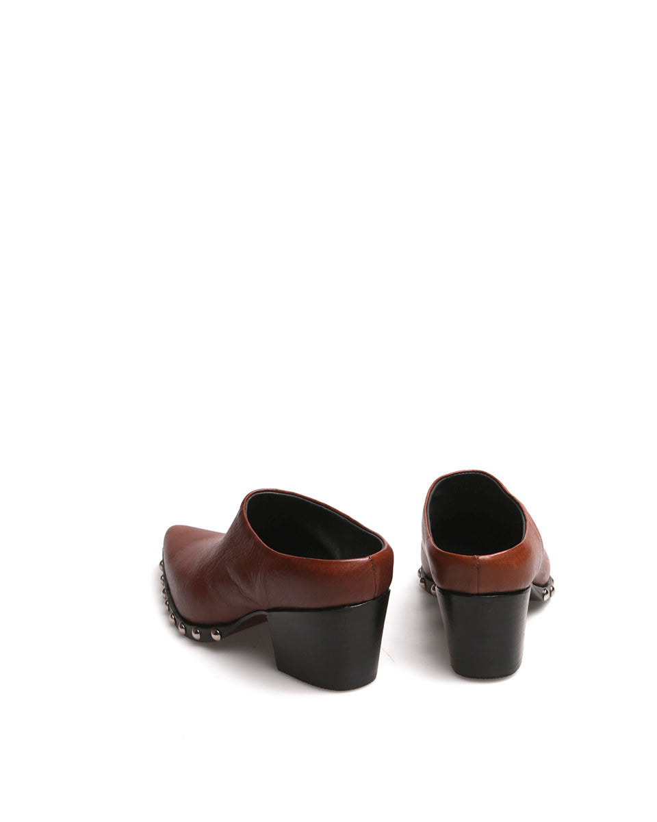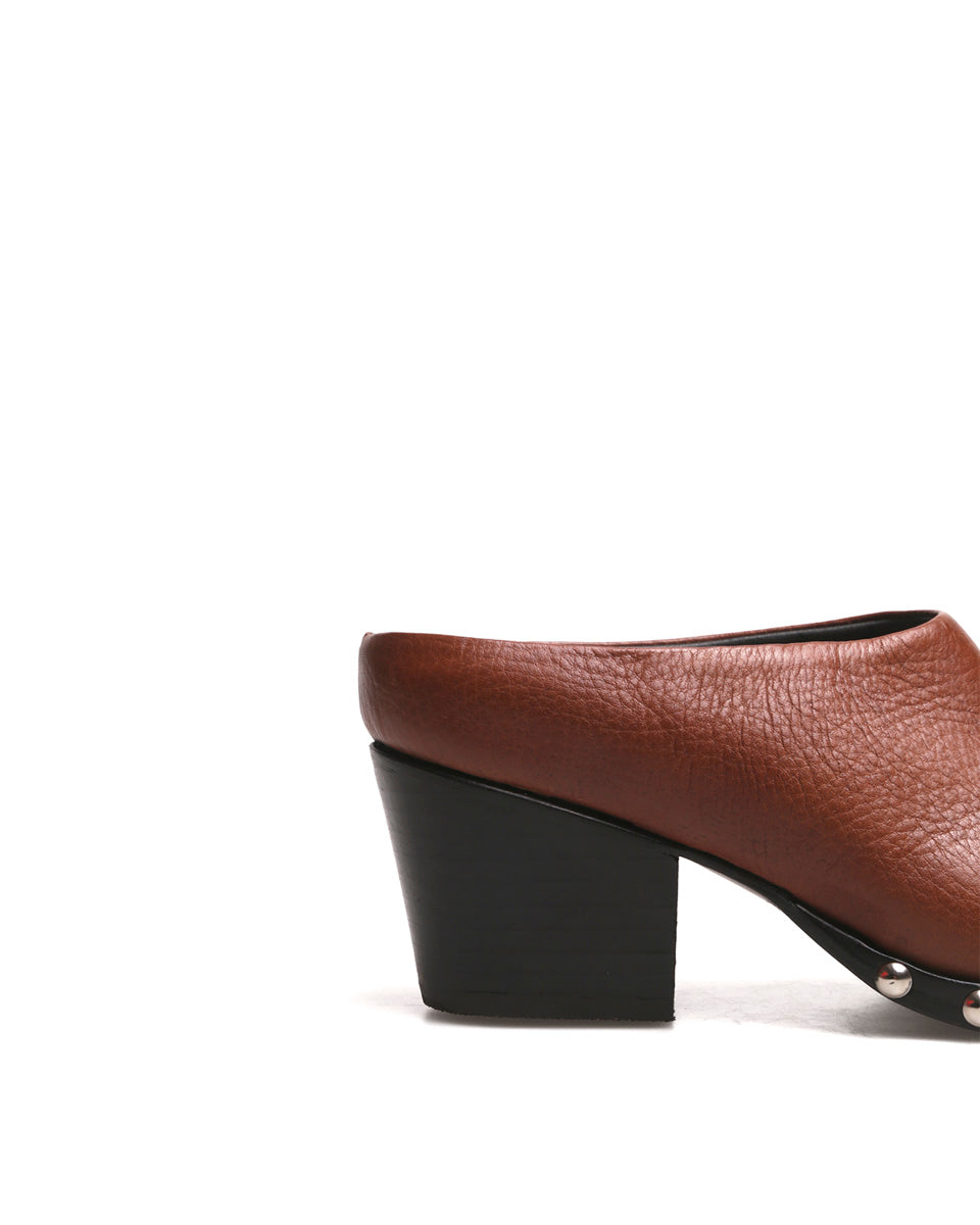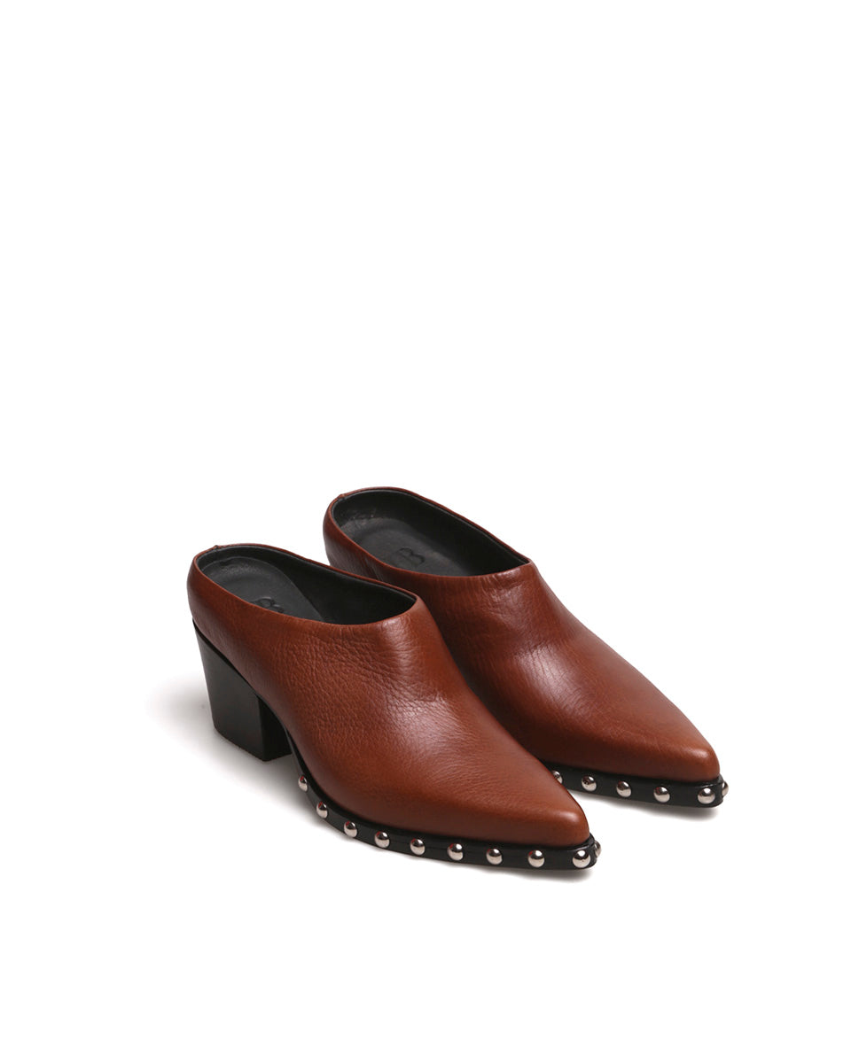 BEX es un zueco con taco texano, en punta. Está realizado en cuero bridge, es decir que cuenta con un acabado natural que resalta el carácter único de cada pieza. La punta es estilizada y el cuero está remachado con tachas redondas color plata.
